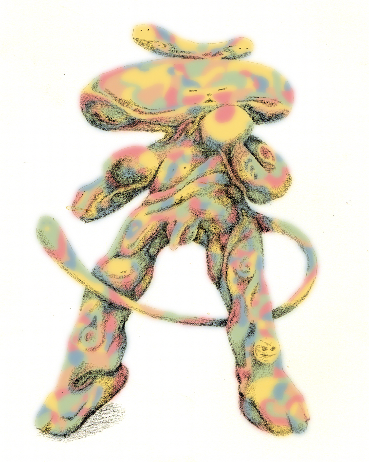 i drew another cool fellow with pencils. it’s been fun making these guys and adding a lil crazy color underneath. i’d like to make one more, and maybe arrange the four of them into a riso print.